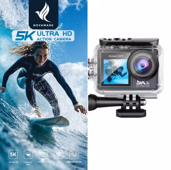 De NovaWare 5K Action Camera legt jouw avonturen vast in haarscherpe 5K-resolutie met 60FPS en 24MP foto’s. Dankzij beeldstabilisatie, waterdichte behuizing (tot 30M), Wi-Fi bediening en een complete set accessoires ben je direct klaar voor actie – zowel boven als onder water.