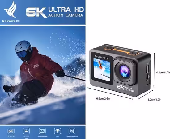 De NovaWare 6K Action Camera is een veelzijdige actiecamera met 6K-video, 50MP foto's, beeldstabilisatie (EIS) en een IMX sensor voor superieure beeldkwaliteit. Waterdicht tot 30 meter, inclusief 64GB SD-kaart en accessoires. Ideaal voor vloggen, sporten en onderwateropnames.