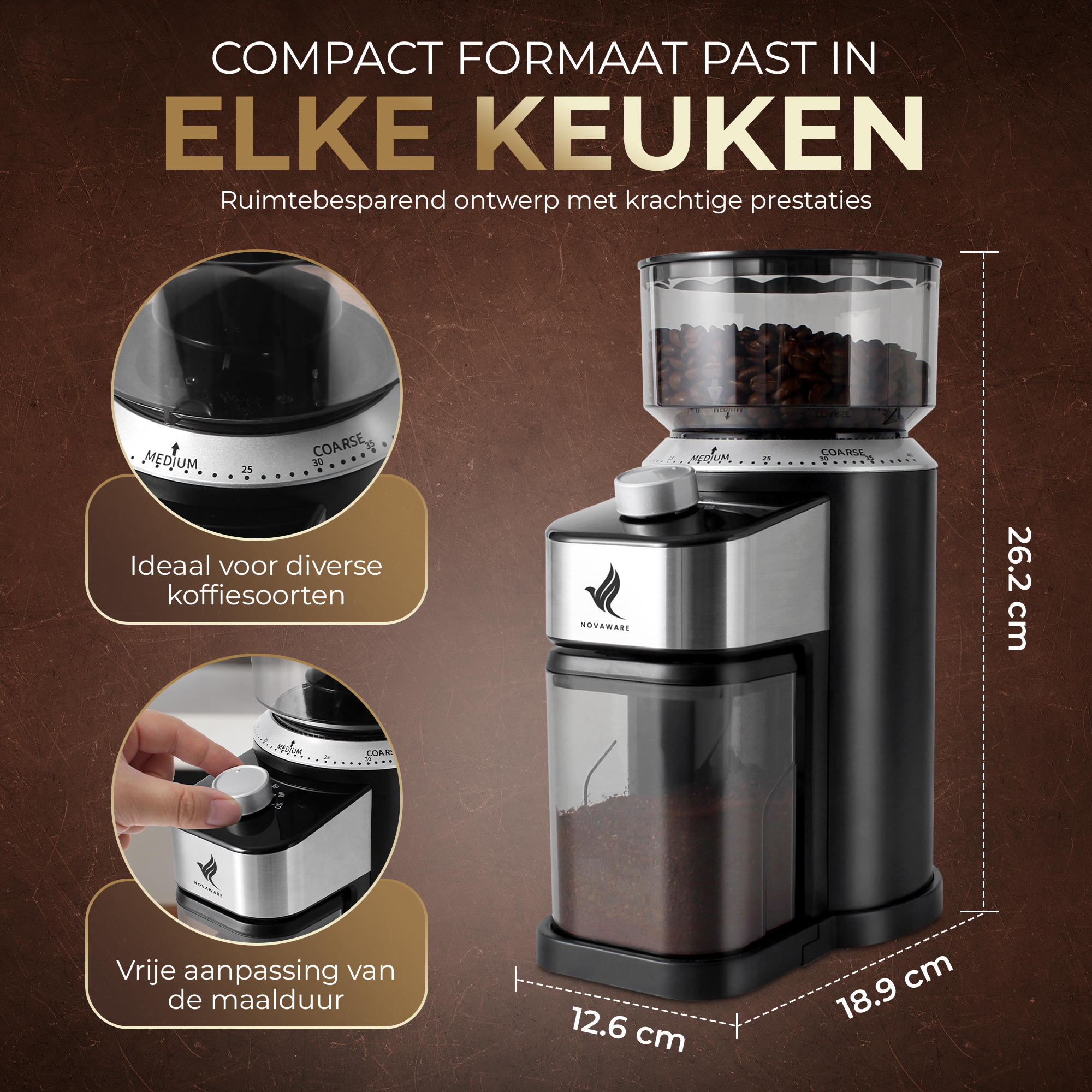 • Compact formaat – Onze koffiemaler past eenvoudig in elke keuken, met een afmeting van 18.9cm x 12.6cm x 26.2cm.