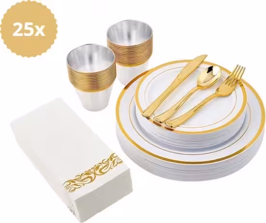 Complete wit-gouden serviesset voor 25 personen. Inclusief borden, bestek, bekers en servetten. Herbruikbaar en ideaal voor bruiloften, verjaardagen en andere feestelijke gelegenheden.