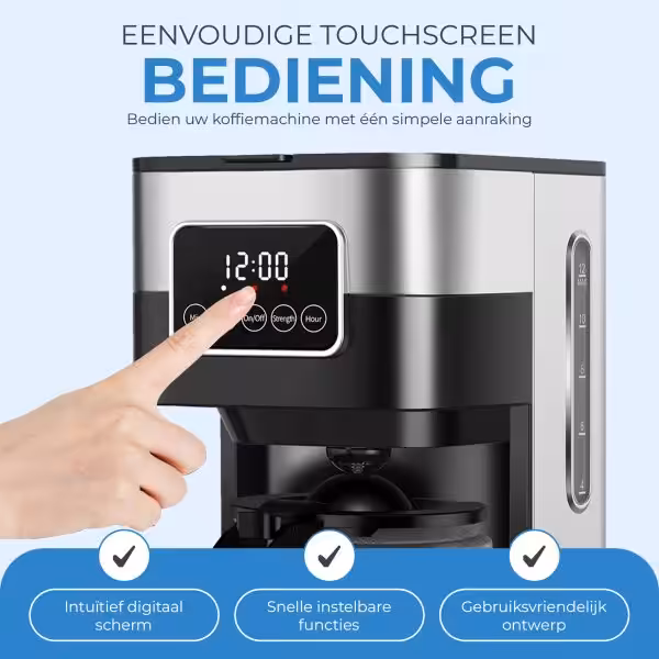 Met het NovaWare Koffiezetapparaat zet je moeiteloos tot 12 kopjes heerlijke koffie met één druk op het touchscreen. Dankzij de slimme timer, showerhead technologie en warmhoudfunctie van 45 minuten geniet je altijd van optimale smaak en gemak. Het strakke design en de herbruikbare filter maken dit koffiezetapparaat een stijlvolle én duurzame keuze voor elke keuken.