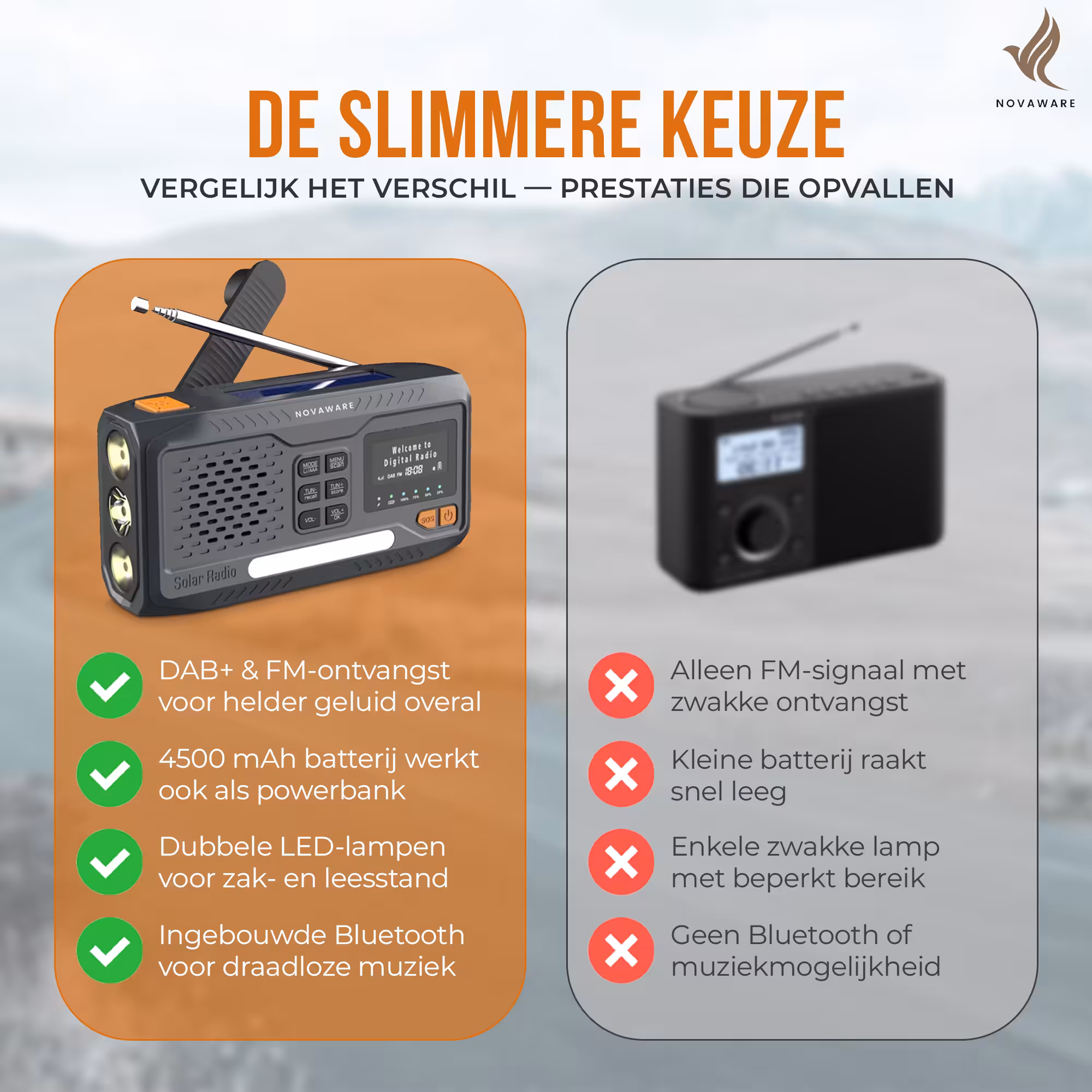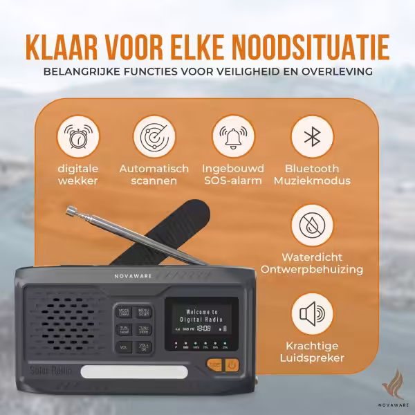 Met de NovaWare Noodradio Solar opwindbaar ben je altijd voorbereid, waar je ook bent. Of je nu gaat kamperen, geniet van een outdoor avontuur of simpelweg wilt zorgen dat je nooit zonder stroom of informatie komt te zitten in noodsituaties, deze draagbare radio heeft het allemaal. De NovaWare Noodradio combineert een krachtige 4500mAh powerbank op zonne-energie, een DAB+/FM-radio voor betrouwbare nieuws- en weerupdates, en een handige Bluetooth speaker in één compact en robuust apparaat. Deze noodradio DAB+ is een onmisbare toevoeging voor elk noodpakket en perfect voor iedereen die graag voorbereid is op het onverwachte.