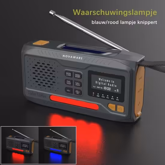 Met de NovaWare Noodradio Solar opwindbaar ben je altijd voorbereid, waar je ook bent. Of je nu gaat kamperen, geniet van een outdoor avontuur of simpelweg wilt zorgen dat je nooit zonder stroom of informatie komt te zitten in noodsituaties, deze draagbare radio heeft het allemaal. De NovaWare Noodradio combineert een krachtige 4500mAh powerbank op zonne-energie, een DAB+/FM-radio voor betrouwbare nieuws- en weerupdates, en een handige Bluetooth speaker in één compact en robuust apparaat. Deze noodradio DAB+ is een onmisbare toevoeging voor elk noodpakket en perfect voor iedereen die graag voorbereid is op het onverwachte.