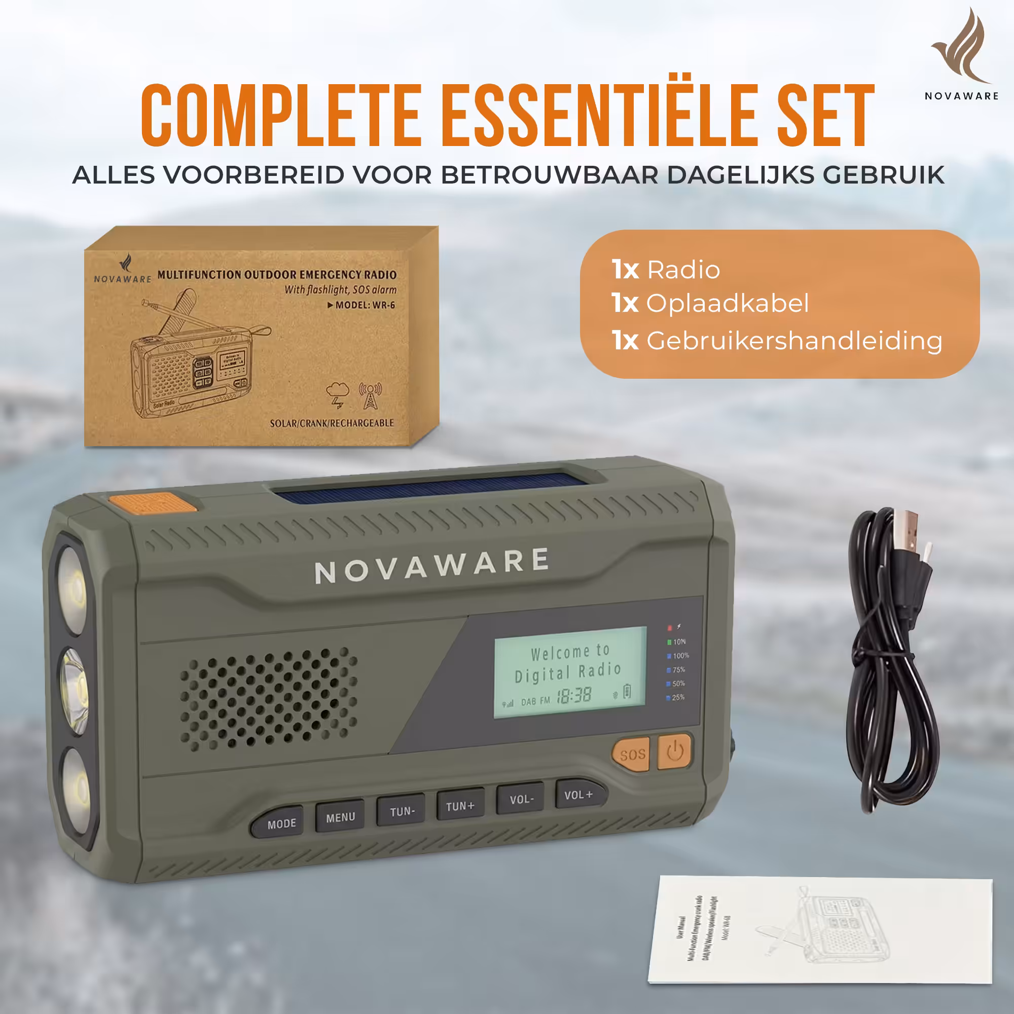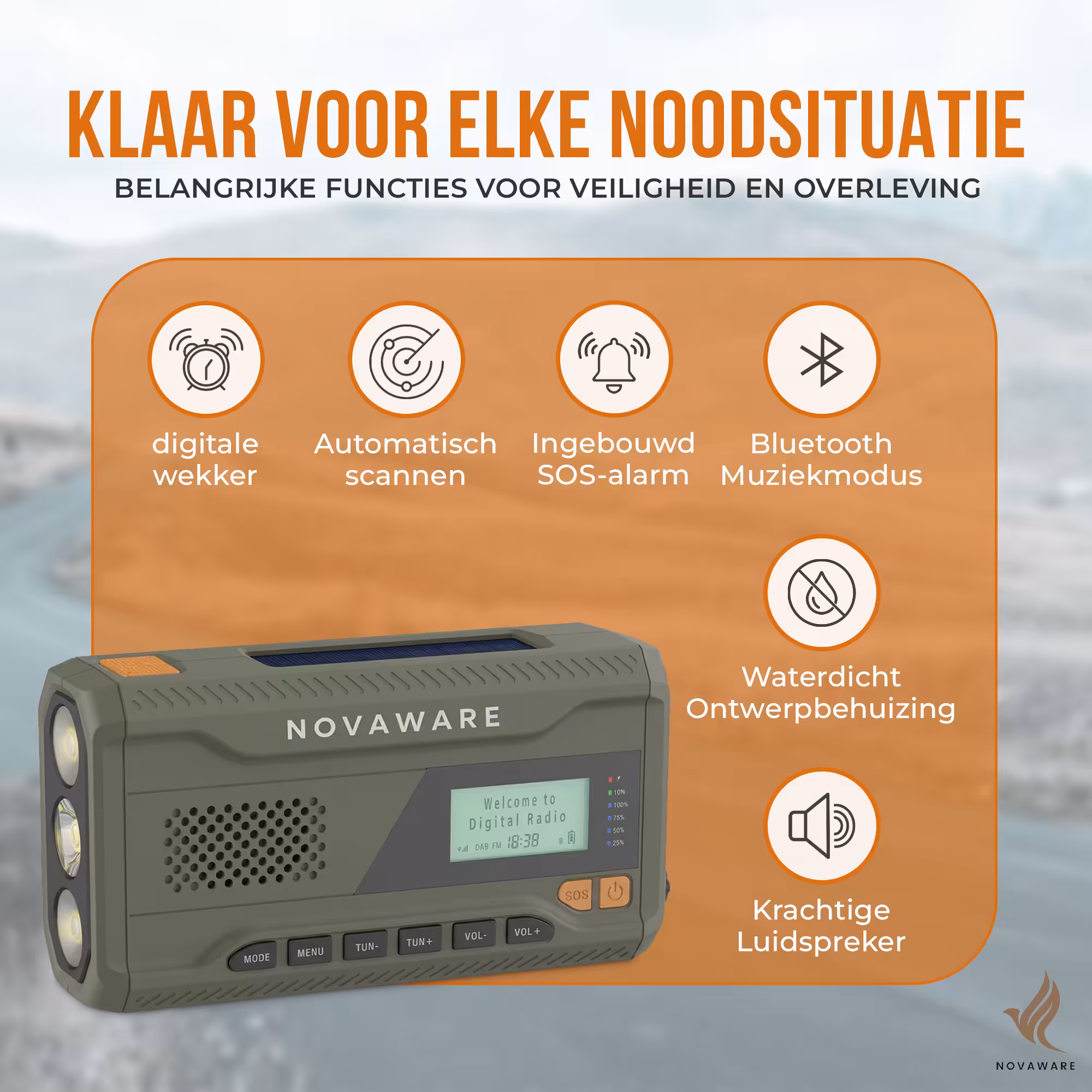 Met de NovaWare Noodradio Solar opwindbaar ben je altijd voorbereid, waar je ook bent. Of je nu gaat kamperen, geniet van een outdoor avontuur of simpelweg wilt zorgen dat je nooit zonder stroom of informatie komt te zitten in noodsituaties, deze draagbare radio heeft het allemaal. De NovaWare Noodradio combineert een krachtige 4500mAh powerbank op zonne-energie, een DAB+/FM-radio voor betrouwbare nieuws- en weerupdates, en een handige Bluetooth speaker in één compact en robuust apparaat. Deze noodradio DAB+ is een onmisbare toevoeging voor elk noodpakket en perfect voor iedereen die graag voorbereid is op het onverwachte.