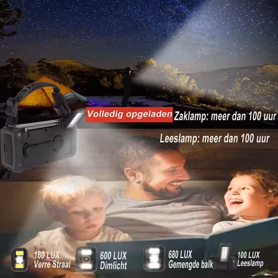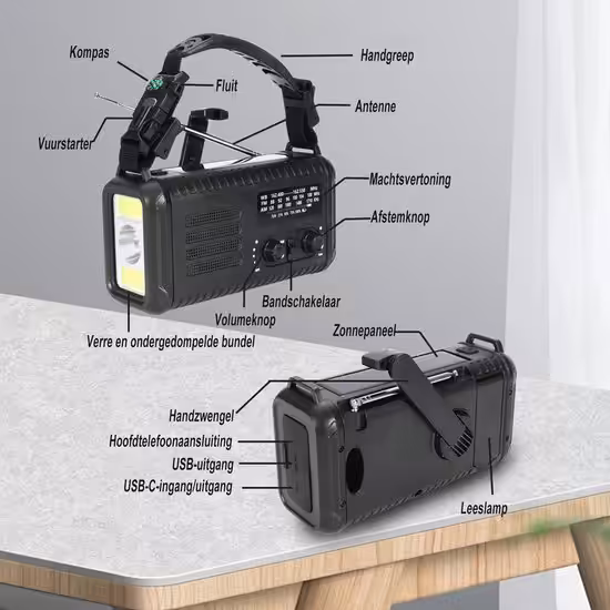 Met de NovaWare Noodradio Solar opwindbaar ben je altijd voorbereid, waar je ook bent. Of je nu gaat kamperen, geniet van een outdoor avontuur of simpelweg wilt zorgen dat je nooit zonder stroom of informatie komt te zitten in noodsituaties, deze draagbare radio heeft het allemaal. De NovaWare Noodradio combineert een krachtige 20.000mAh powerbank op zonne-energie en een FM/AM-radio voor betrouwbare nieuws- en weerupdates in één compact en robuust apparaat. Inclusief kompas, reddingsfluitje en snijmesje gevestigd aan deze noodradio is het een onmisbare toevoeging voor elk noodpakket en perfect voor iedereen die graag voorbereid is op het onverwachte.
