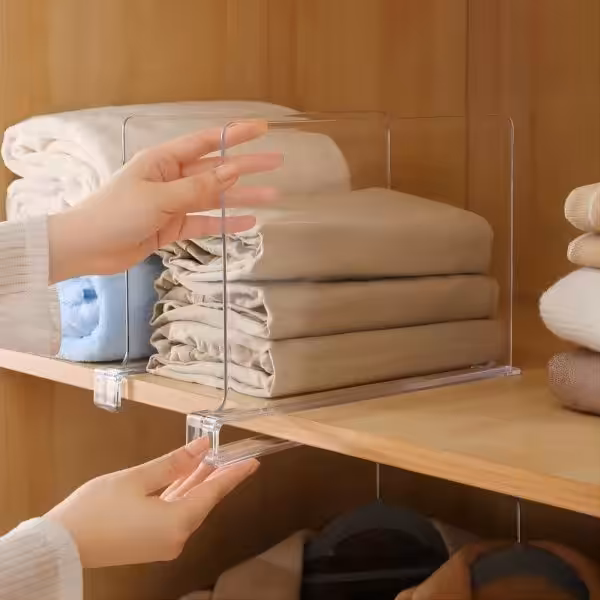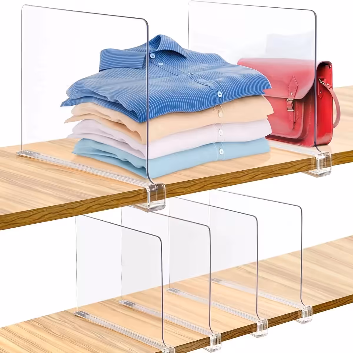 Ben je het zat om steeds weer tegen rommelige planken aan te kijken? Met deze transparante plankverdelers van acryl breng je in een handomdraai structuur aan in je kledingkast, boekenkast, keukenkast of voorraadkast. Dankzij het slimme en minimalistische ontwerp scheid je eenvoudig stapels kleding, boeken, servies of andere spullen zonder dat je extra meubels hoeft aan te schaffen.