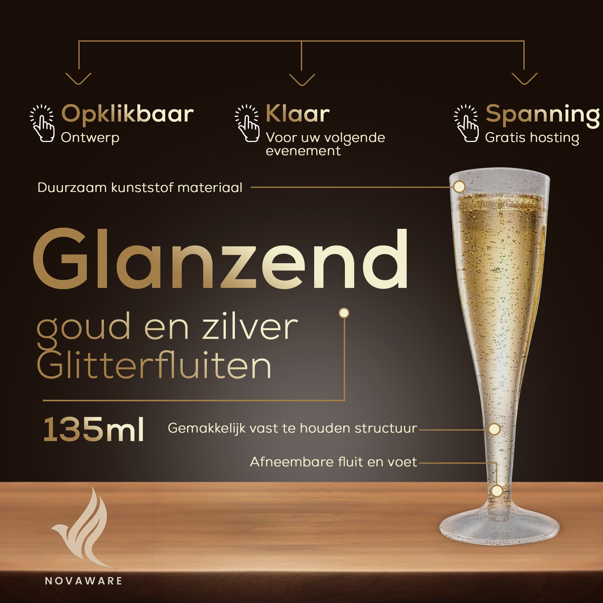 -16%NovaWarePlastic Champagneglazen 120 Stuks – Gouden en Zilveren Glitter Feestelijk glitterdesign Herbruikbaar en stevig Voordeelverpakking (120 stuks)