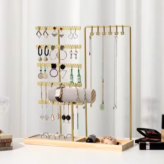 Ontdek de NovaWare Sieradenhouder XL, de ideale oplossing voor het stijlvol opbergen van al je sieraden. Dit sieradenrekje met oorbellenrekje is ontworpen met oog voor detail en biedt volop ruimte voor je favoriete kettingen, armbanden, horloges en oorbellen. Dankzij het elegante gouden ontwerp voeg je een vleugje luxe toe aan je kaptafel of badkamer, terwijl je al je sieraden netjes en overzichtelijk bewaart.