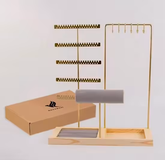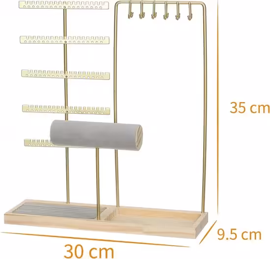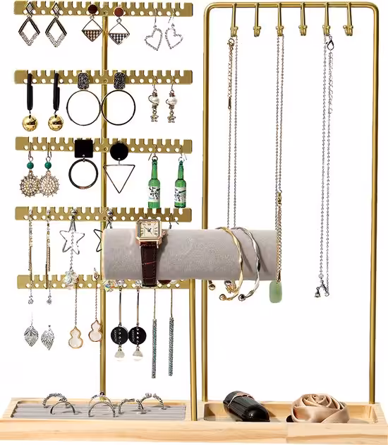 Ontdek de NovaWare Sieradenhouder XL, de ideale oplossing voor het stijlvol opbergen van al je sieraden. Dit sieradenrekje met oorbellenrekje is ontworpen met oog voor detail en biedt volop ruimte voor je favoriete kettingen, armbanden, horloges en oorbellen. Dankzij het elegante gouden ontwerp voeg je een vleugje luxe toe aan je kaptafel of badkamer, terwijl je al je sieraden netjes en overzichtelijk bewaart.