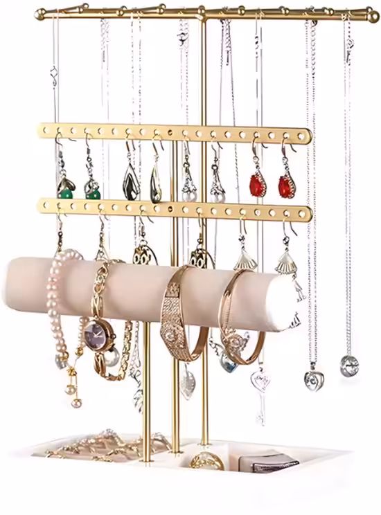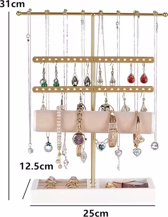 • Dit unieke sieradenrekje maakt het opbergen van oorbellen, halskettingen, ringen en armbanden eenvoudig, zowel thuis als in een juwelierswinkel. Het directe overzicht bespaart je aanzienlijk tijd en moeite bij het organiseren van je sieraden. De elegante uitstraling past naadloos in elk interieur en is een perfecte toevoeging aan je badkamer, kaptafel, kast of sieradenkamer.