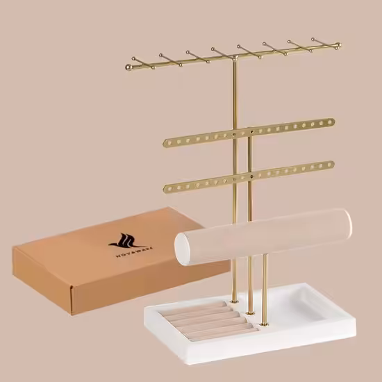 • Onze sieradenstandaard is volledig gemaakt van hoogwaardig metaal en afgewerkt met elegante houten details. Het frame van onze sieradenhouder heeft een lichte en gladde galvanisatie ondergaan, wat zorgt voor een fijne textuur, uitzonderlijke slijtvastheid en langdurige kleurvastheid.
