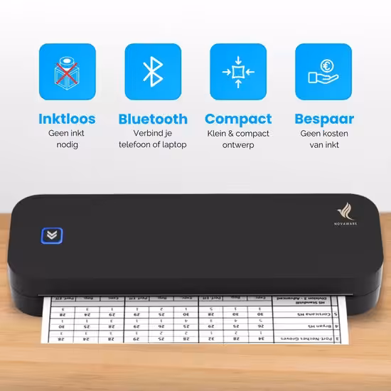 Of je nu verzendlabels, barcode labels, stickers of tijdelijke tattoos wilt afdrukken, de NovaWare Thermische Printer A4 is de oplossing voor jouw printbehoeften – draadloos, compact en kostenefficiënt!